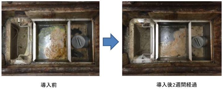 導入後 2週間で油脂が液状化し、堆積量も約半分以下に軽減した。ニオイも全く感じられない。