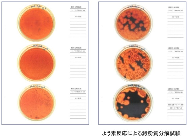 MR106の澱粉に対する分解能力試験の結果、一般的なバクテリアと比べ澱粉質の分解能力が極めて高いことが確認され、『レベル5』という最高評価を受けました。(試験機関:バチルワールド)従来、うどん店やパン屋などの施設では、澱粉質の含有量が多い排水の処理に苦慮していましたが、MR106を使用する事で澱粉質の分解を速め、排水処理設備の負担を減らすことが可能です。