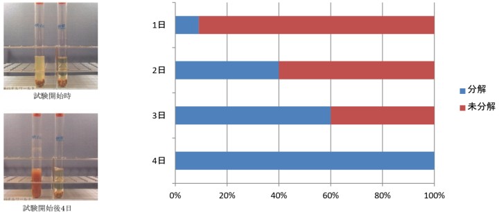 蛋白質(タンパク質)は通常の洗剤(界面活性剤)等では分解されにくい物質のひとつです。MR106の蛋白質に対する分解能力試験の結果、4日間で100%分解する事ができました。この結果から、一般的なバクテリア(通常6~7日間で分解)と比べても、MR106は蛋白質分解能力が高く、分解速度が速いことが証明されました。(試験機関:バチルワールド)蛋白質は有機廃棄物に含まれる代表的な物質であり、特に精肉工場や鮮魚店など蛋白質が多く含まれる排水の処理にはMR106が効果的です。
