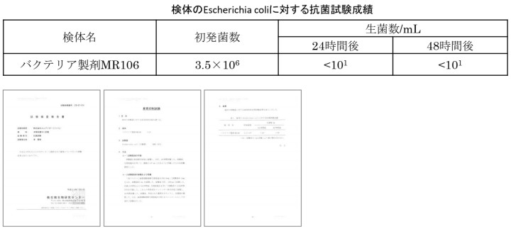商品に使用されているバクテリアMR-106は、バイオ最先端技術国アメリカで研究開発されたバチルス菌(納豆菌)を中心とした数種類の善玉バクテリアです。これらのバクテリアは世界最大のバイオバンクATCCに登録済みであり、日本国内の第三者専門機関においてもその効果、安全性が確認されたハイレベルのバクテリアです。